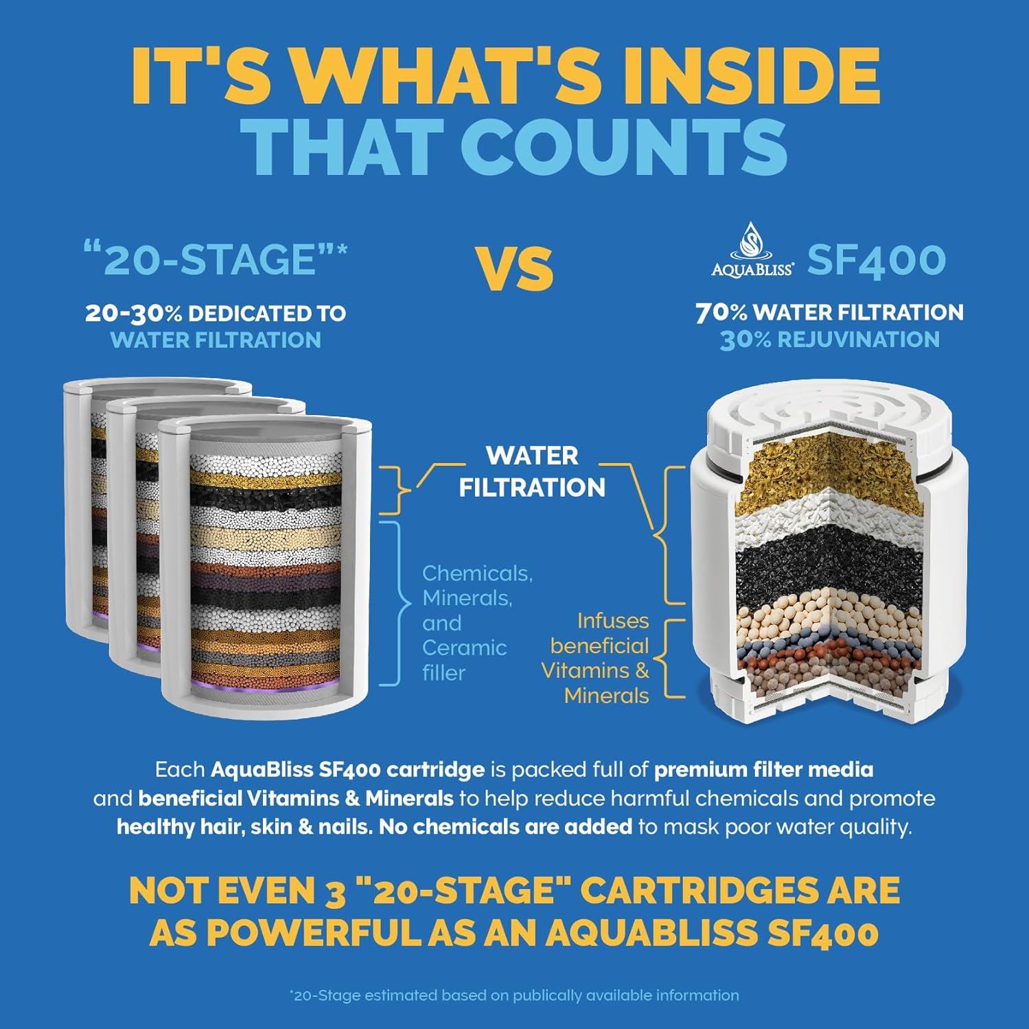 Maximum Power Stages – No Gimmicks, Fillers or Fluff: You wouldn’t buy a pager nowadays, so don’t fall for a 15+, 20+ or 100 stage shower head filter. At AquaBliss we’re constantly improving: We added 40% more of the positive medium that filters, purifies, and beautifies. Then condensed all the empty particulate space. So you acquire 2x the filtration & beauty power, no 20-Stage water blocking filter required.